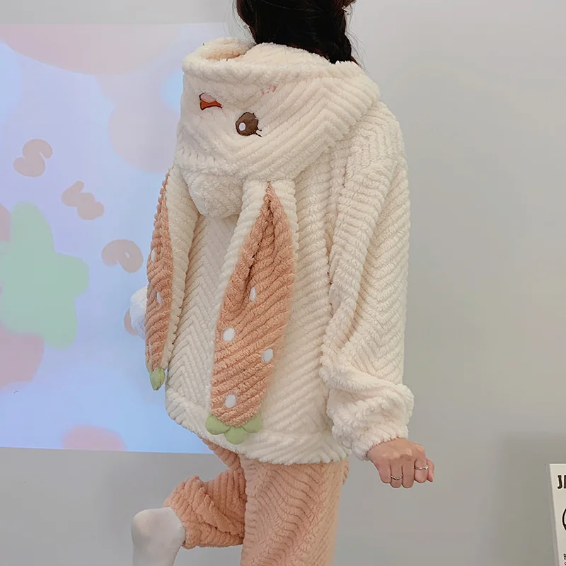 2024 New Plush Set for Women Thickening Hooded Long Sleeve Outfits for Women 2 Piece Set Cute Strawberries Printing Women Clothe