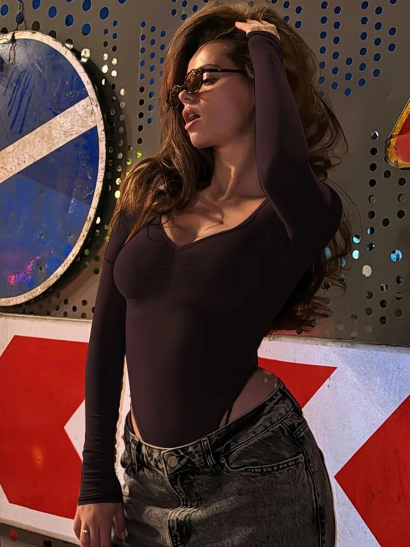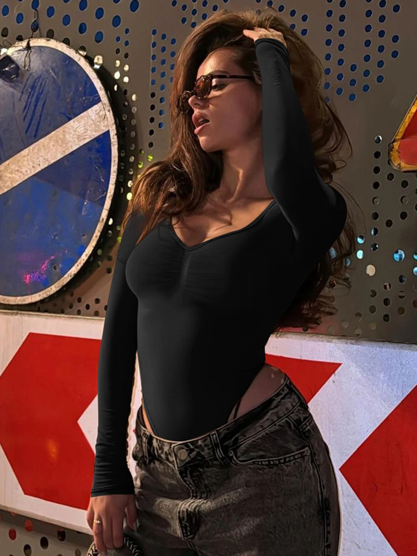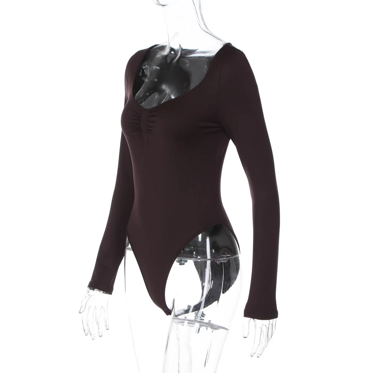 Dulzura O-Neck Long Sleeve Shirring Slim Bodysuit Women'S Solid Casual Versatile Romper Party Club Street Autumn Winter Clothes