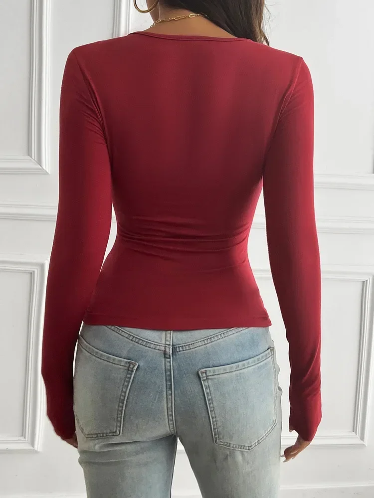 Lady's Spring Summer Y2K Undershirt Sexy Spicy Girl Deep V Splicing Transparent Long Sleeve Top Solid Color Bottoming Shirt